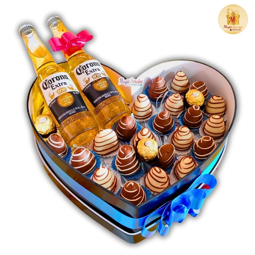 Una Caja en forma de corazón contiene 2 cervezas coronas, 3 chocolates ferreros, 11 fresas con chocolate blanco, 11 fresas con chocolate negro y un lazo decorativo!