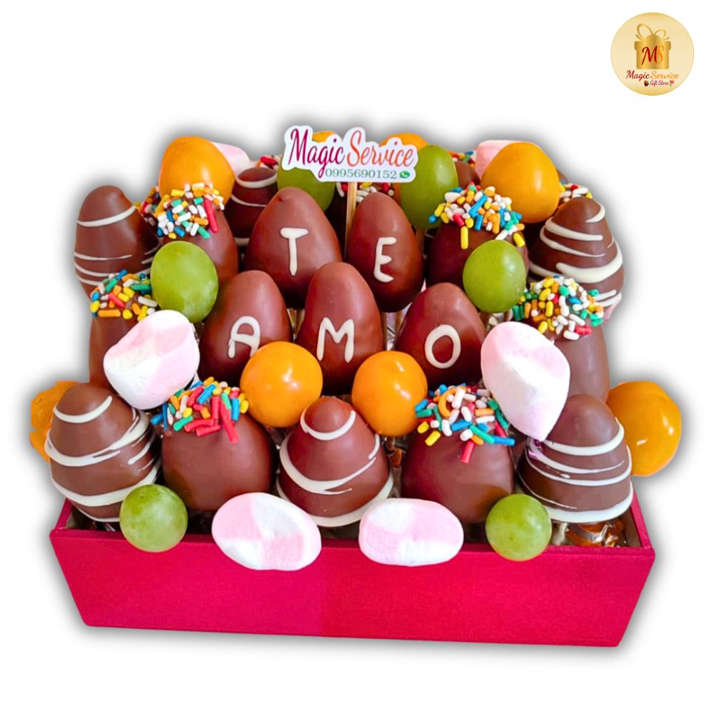 Caja cuadrada mediana contiene mensaje personalizado en fresas de chocolate negro, fresas con aderezos