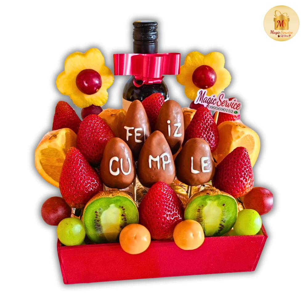 1 caja cuadrada de 18×18 cm contiene, 1 Botella de vino pequeña, 8 fresas sin chocolate, 5 fresas con chocolate y escrito un mensaje, Kiwy, naranja especial, piñas, uvillas, uvas rojas y verdes.