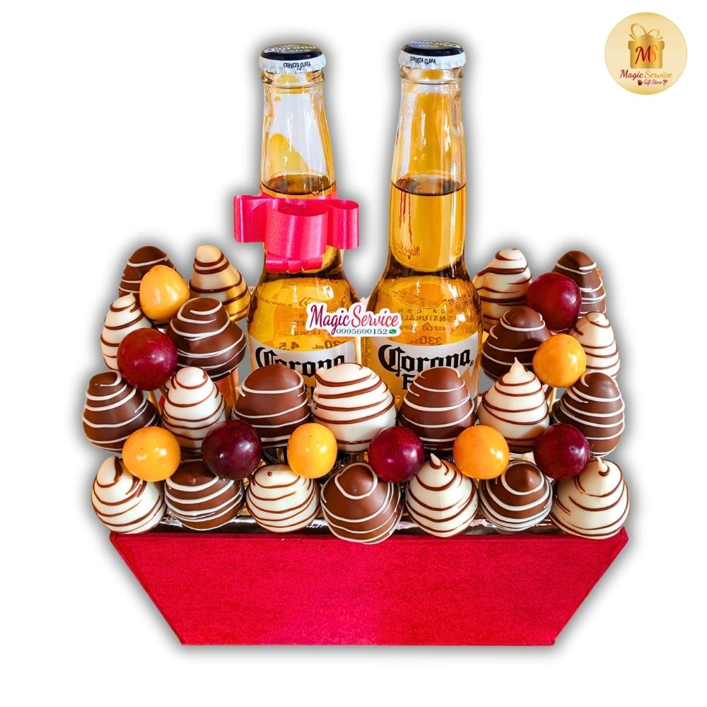 Caja de Madera tipo Barco contiene fresas con chocolate blanco y negro decoradas con elegantes lineas de chocolate, dos cervezas corona.