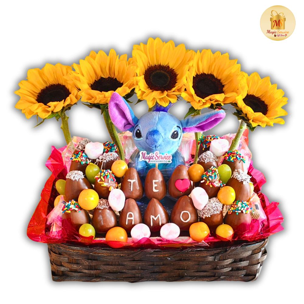 1 Canasta rectangular con 5 girasoles, 1 peluche pequeño (escoger modelo de los disponibles), fresas con chocolates y toppings variados y Fresas con un Mensaje corto (personalícelo).